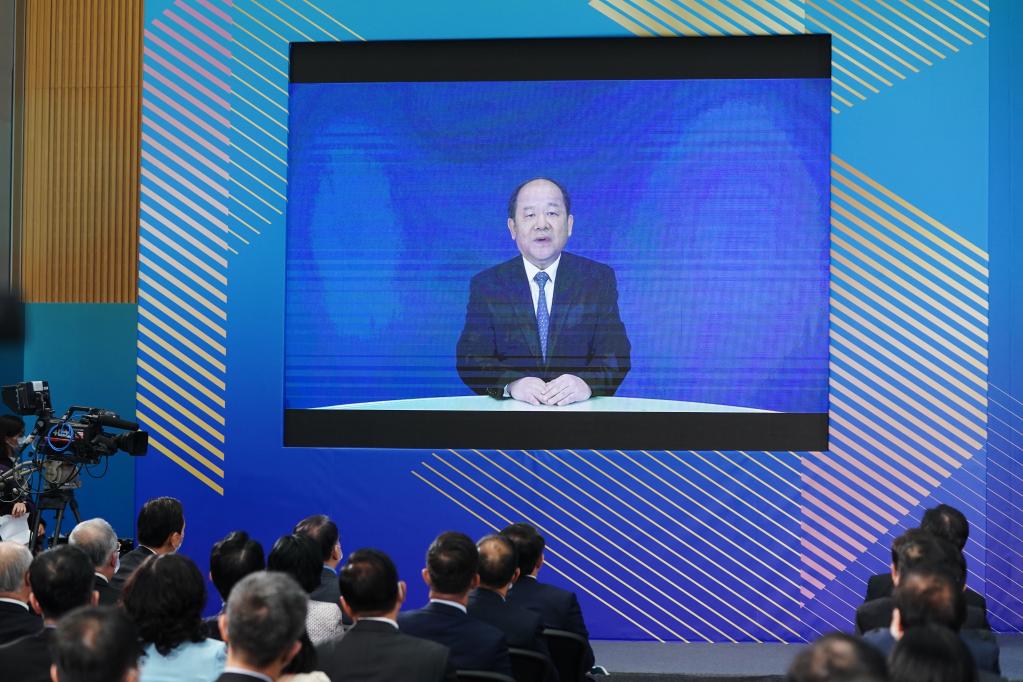 8月23日,在香港特區政府總部,國家發展改革委副主任寧吉喆通過視頻致辭。新華社記者 王申 攝