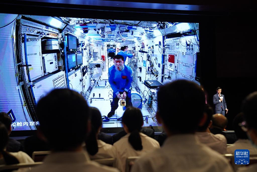 9月3日,正在天宮空間站執行任務的神舟十二號乘組與香港科技工作者、教師和大中學生進行天地連線互動。新華社記者 呂小煒 攝