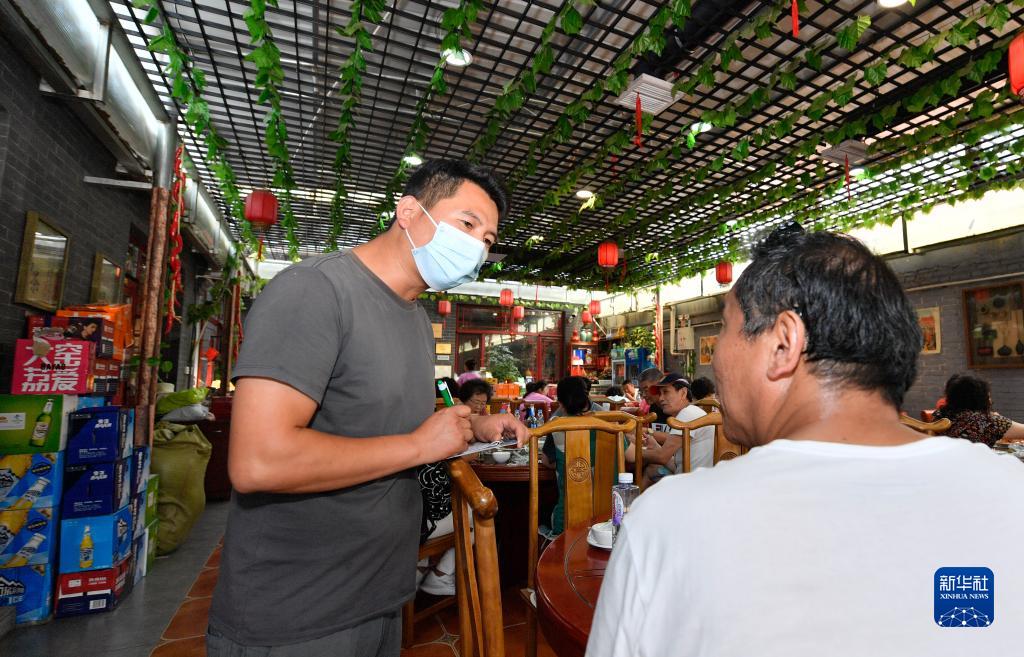 在天津市寶坻區黃莊鎮小辛碼頭村,李超(左)為客人點單(9月2日攝)。