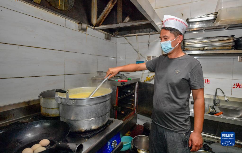 在天津市寶坻區黃莊鎮小辛碼頭村,李超為客人準備早餐(9月3日攝)。新華社記者 孫凡越 攝