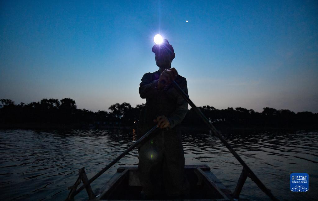 清晨,小辛碼頭村村民在潮白河上捕魚,為該村農家院提供菜品原料(9月3日攝)。新華社記者 孫凡越 攝