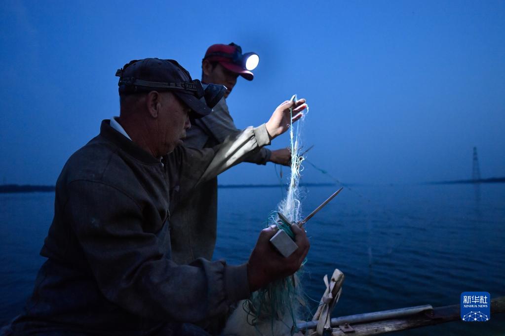 清晨,小辛碼頭村村民在潮白河上整理漁網準備捕魚(9月3日攝)。新華社記者 孫凡越 攝