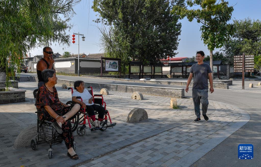 在天津市寶坻區黃莊鎮小辛碼頭村,擔任村委委員的李超(右一)在巡視時與村民交流(9月2日攝)。新華社記者 孫凡越 攝