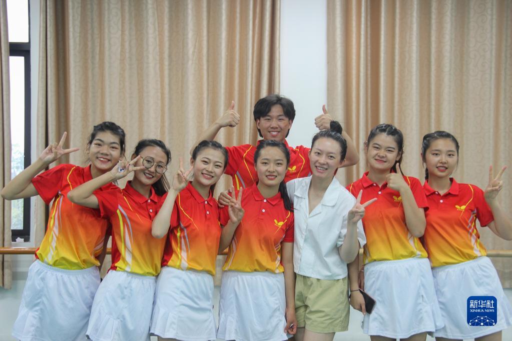 鄧蕓虹(右三)和聽障大學生舞蹈團的部分學生在演出后合影(6月30日攝)。