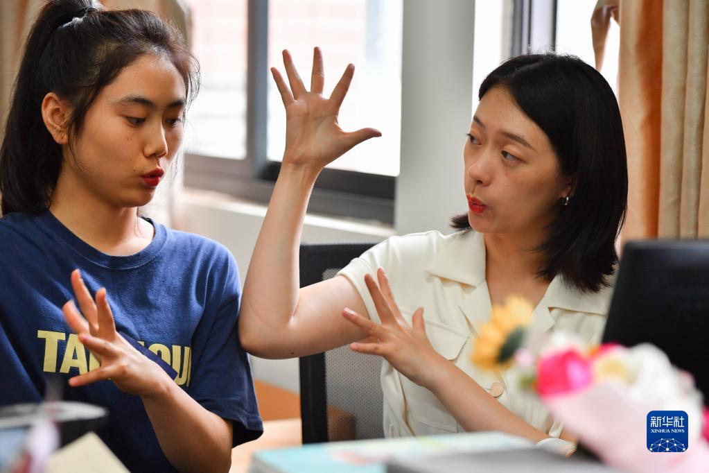 在長沙職業技術學院特殊教育學院,鄧蕓虹(右)在溫習手語表達(9月7日攝)。