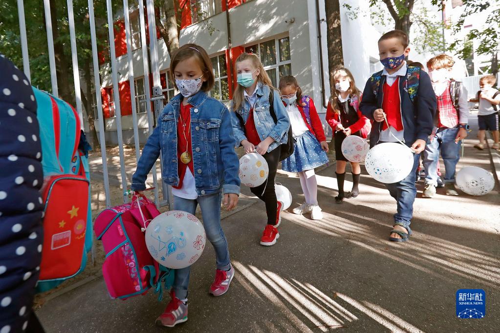 9月13日,在羅馬尼亞首都布加勒斯特,學生進入學校參加新學期開學典禮。當日,羅馬尼亞全國中小學開學,由于疫情日趨嚴重,政府要求所有人員必須戴口罩。