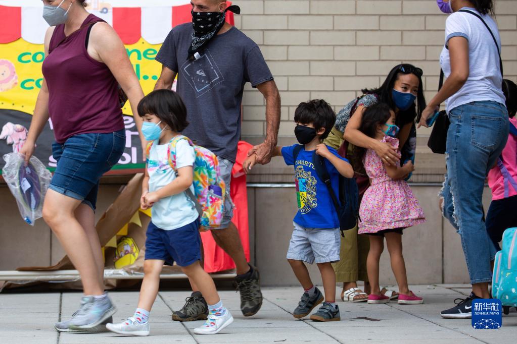9月13日,家長在美國紐約一所公立學校外接學生放學。當日,紐約市公立中小學新學年開學,并全面恢復在校教學。
