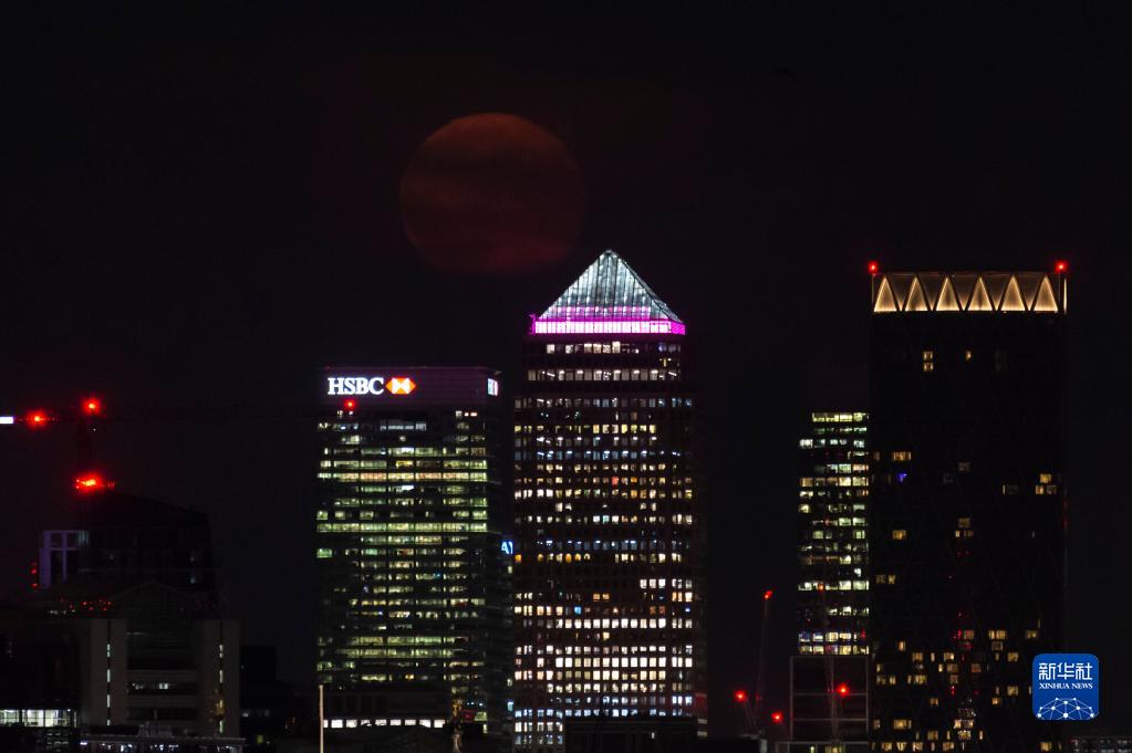 9月21日,滿月在英國倫敦金絲雀碼頭上空升起。