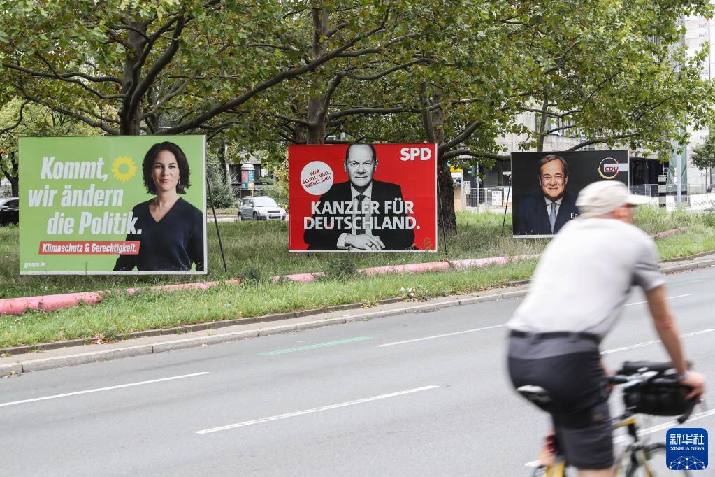 9月25日,在德國首都柏林,一名騎行者經過(從左至右)綠黨總理候選人貝爾伯克、社民黨總理候選人肖爾茨、聯盟黨總理候選人拉舍特的競選海報。
