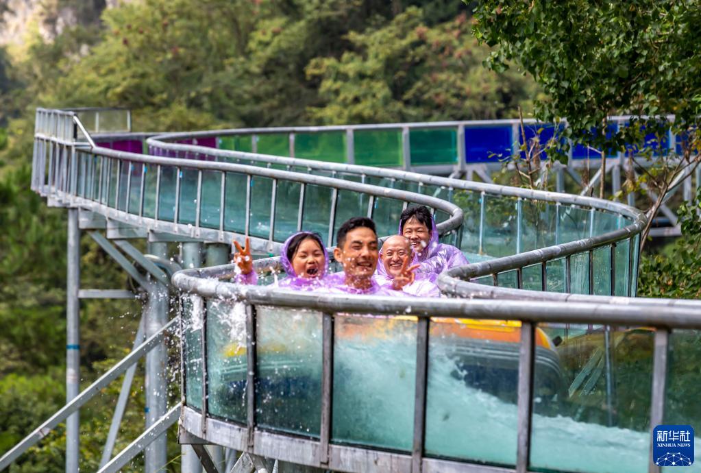 10月2日,游客在貴陽市開陽縣南江大峽谷景區體驗玻璃滑道。