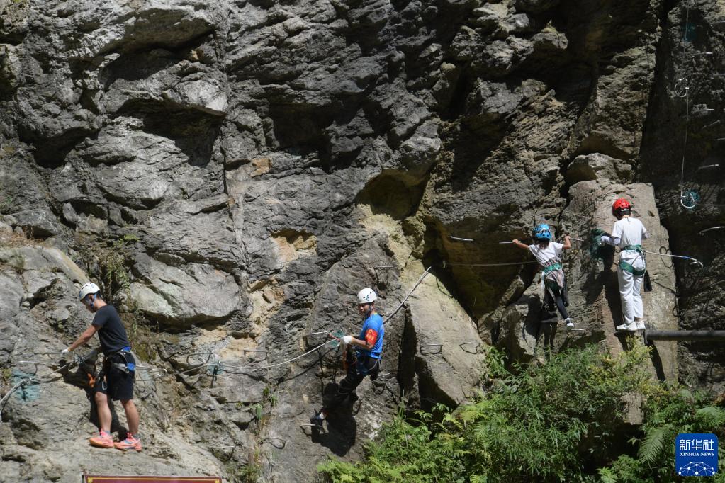 10月2日,在貴陽市開陽縣南江大峽谷,游客在安全員的陪護下體驗攀巖。