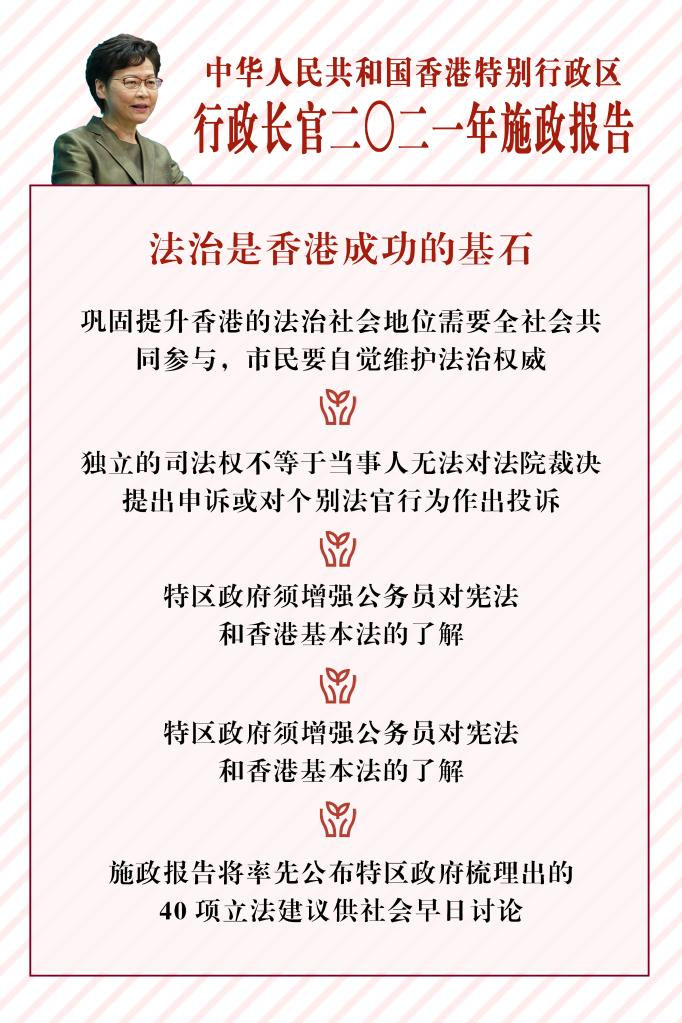 新華社香港10月6日電(記者王茜)香港特區行政長官林鄭月娥6日在特區立法會發表她任期內的第五份施政報告時表示,法治是香港核心價值和賴以成功的基石。