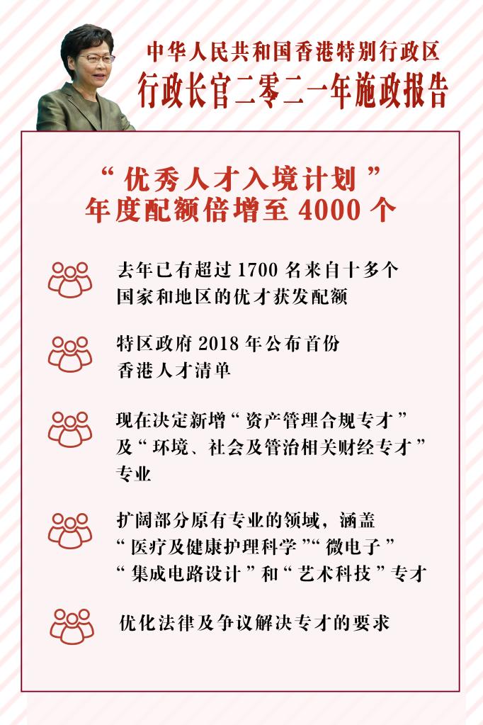 新華社香港10月6日電(記者劉明洋)香港特區行政長官林鄭月娥6日上午在特區立法會發表她任期內的第五份施政報告。林鄭月娥表示,決定進一步將“優秀人才入境計劃”的年度配額倍增至4000個,以吸引世界各地優才來港工作。