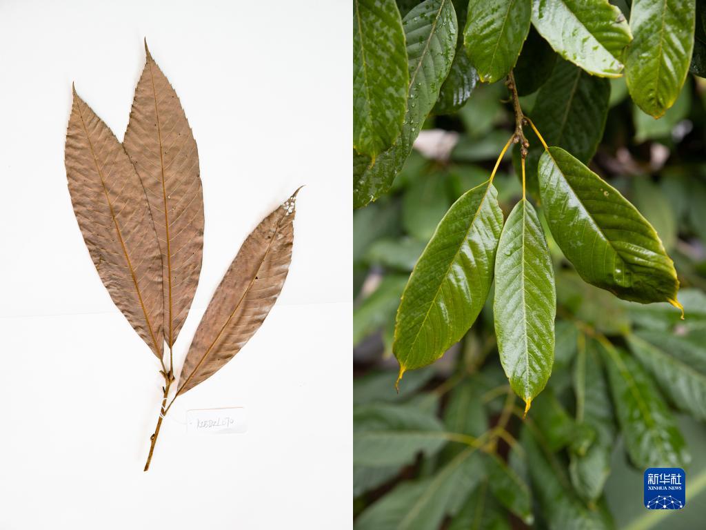 這是10月10日在昆明植物園拍攝的西疇青岡。這張拼版照片分別為科研人員野外采集的標本(左)和在植物園遷地保護后存活下來的同種植物。
