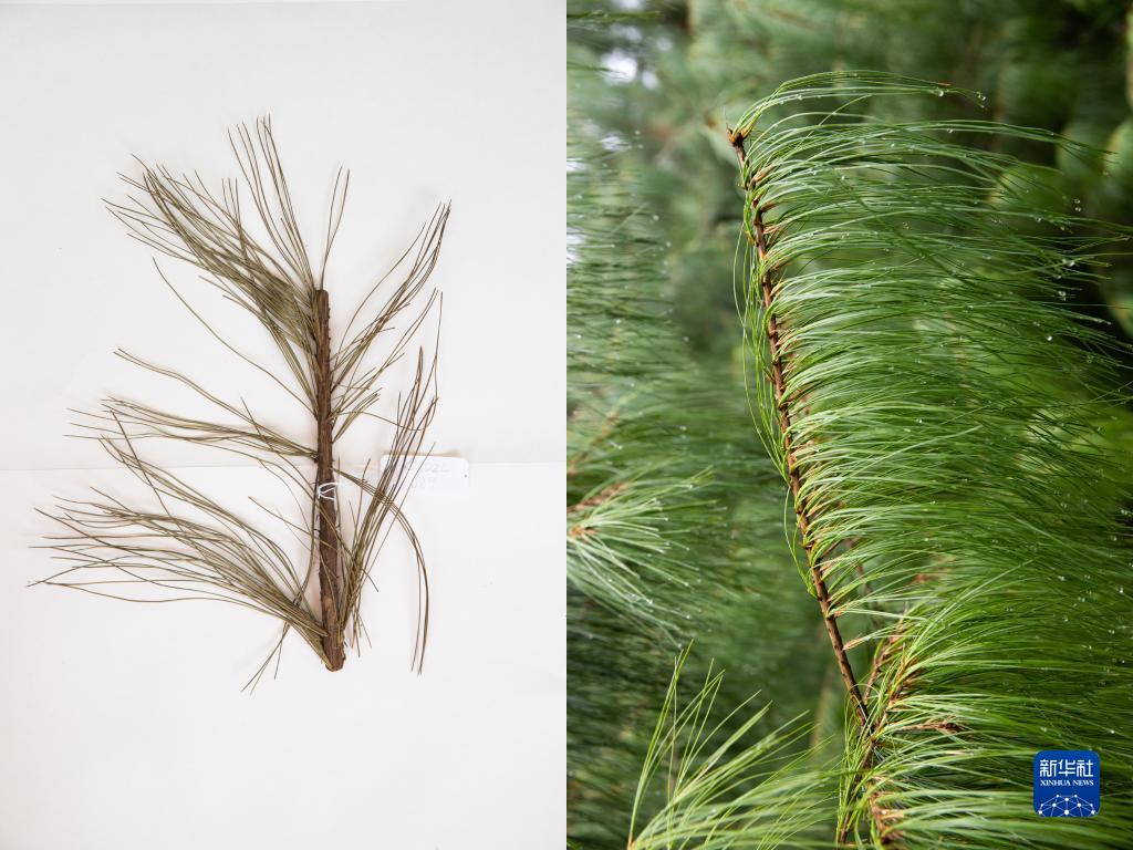 這是10月10日在昆明植物園拍攝的巧家五針松。這張拼版照片分別為科研人員野外采集的標本(左)和在植物園遷地保護后存活下來的同種植物。
