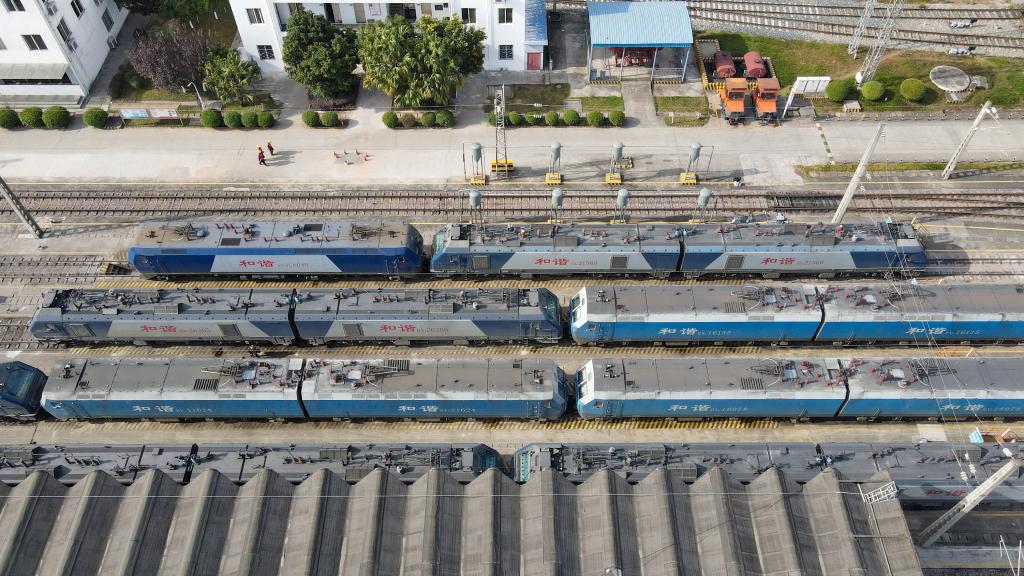 這是11月23日拍攝的??吭诔啥紮C務段的中歐班列編組和諧型機車頭(無人機照片)。新華社記者胥冰潔攝