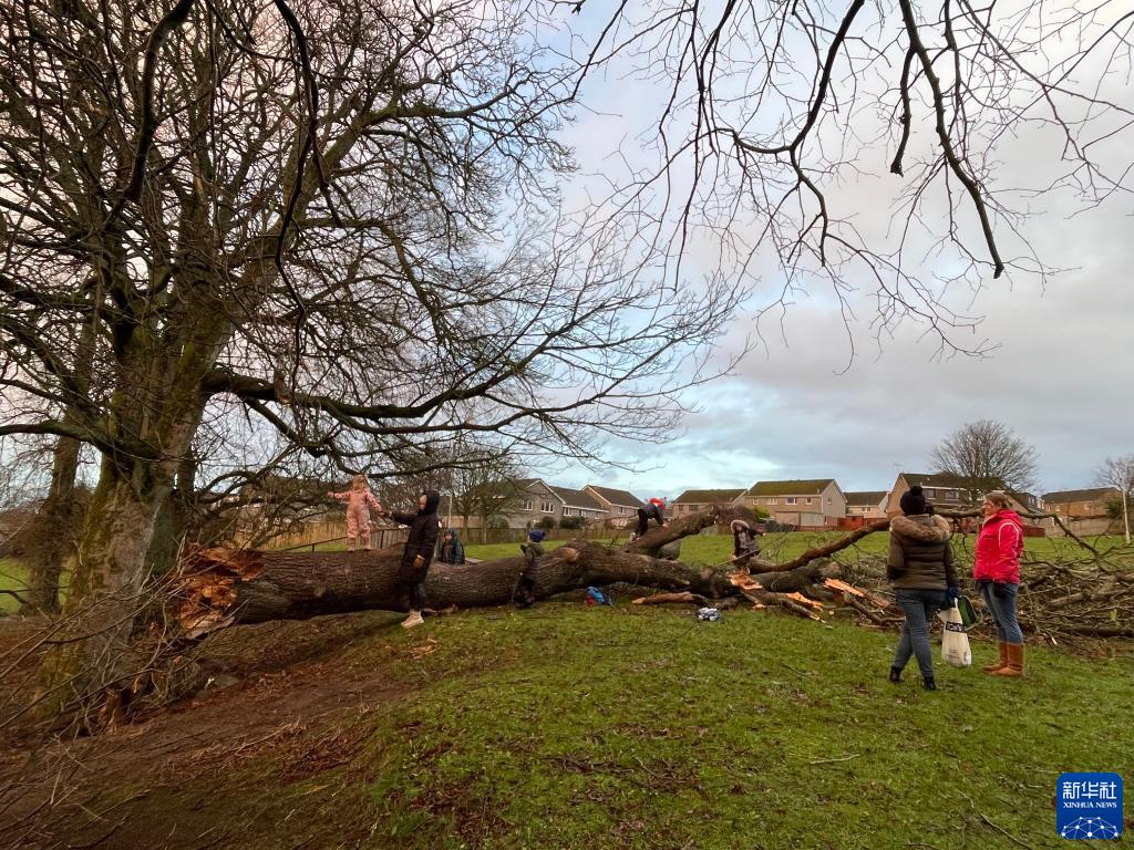 12月8日,在英國蘇格蘭北部城市阿伯丁,兒童在被吹倒的大樹上玩耍。