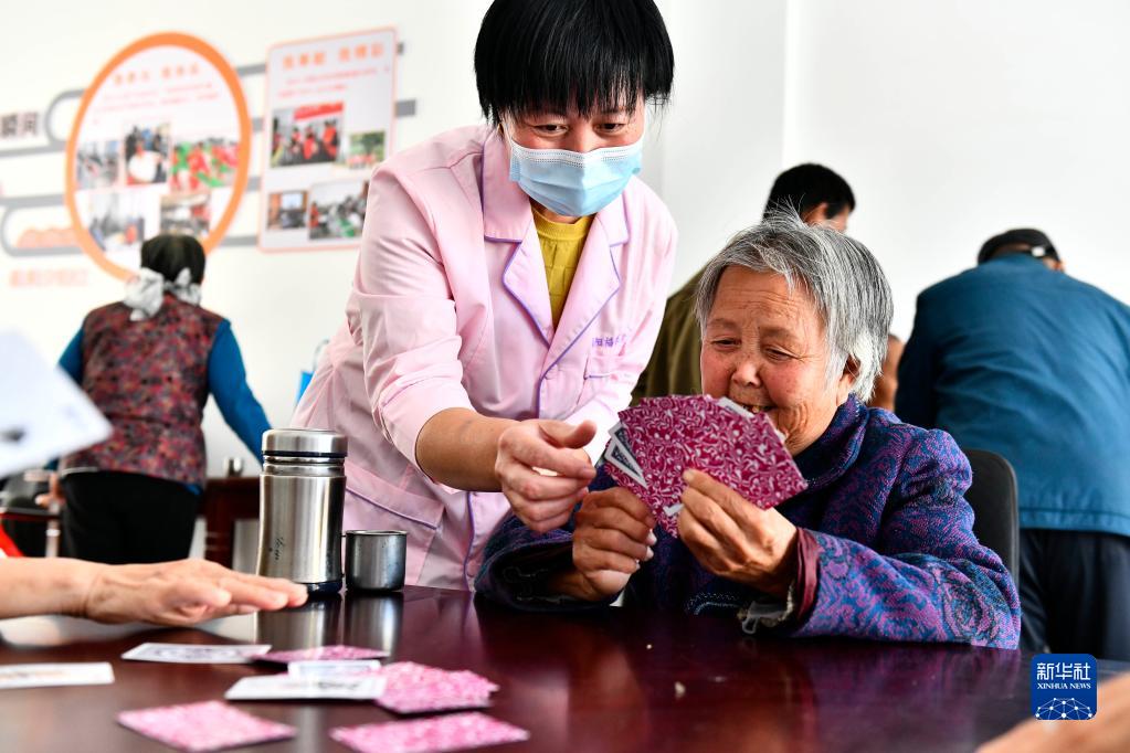 在山東省東營市墾利區楊廟社區養老服務中心,工作人員陪老人打撲克(10月18日攝)。新華社記者 郭緒雷 攝