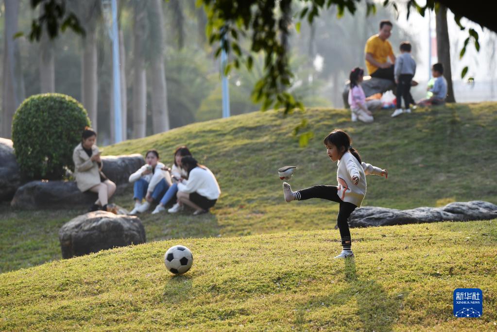 12月11日,在廣西南寧市南湖邊,一名小朋友在踢球。
