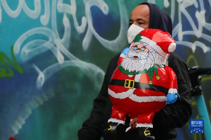 12月11日,一名男子手持圣誕老人氣球在比利時布魯塞爾市中心行走。隨著圣誕節和新年的臨近,比利時首都布魯塞爾的圣誕市場吸引了大批游客與市民。今年的活動在嚴格的防疫措施下舉行,包括查驗健康通行證、要求人們佩戴口罩、保持安全距離等。 新華社記者鄭煥松攝
