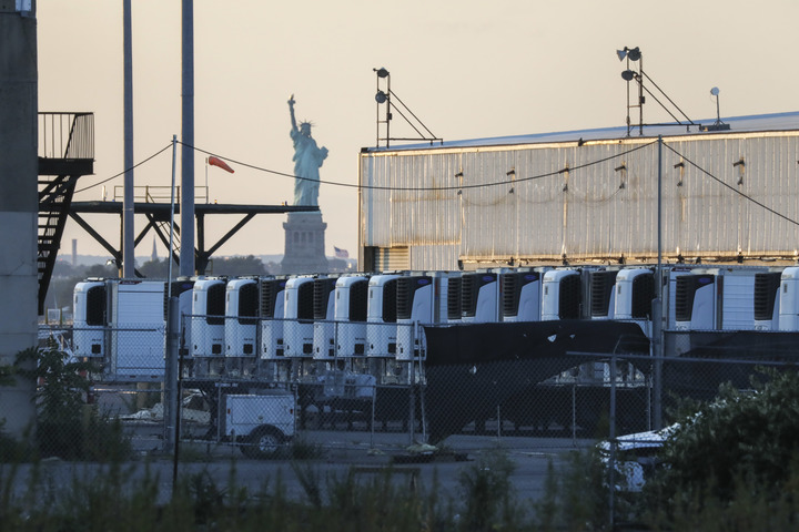 這是在美國紐約布魯克林拍攝的一處臨時停尸場內存放新冠患者遺體的冷藏車(2021年9月6日攝)。新華社記者 王迎 攝