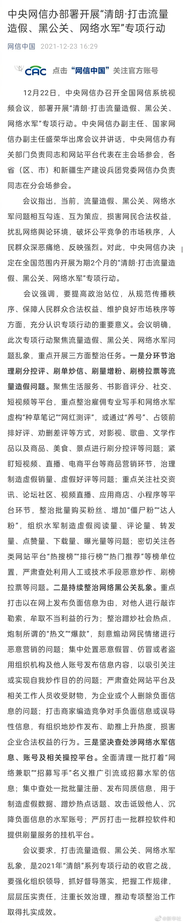 中央網信辦22日召開全國網信系統視頻會議,指出當前流量造假、黑公關、網絡水軍問題相互勾連、互為策應,損害網民合法權益,擾亂網絡輿論環境,破壞公平競爭的市場秩序,人民群眾深惡痛絕、反映強烈。對此,中央網信辦決定在全國范圍內開展為期2個月的“清朗·打擊流量造假、黑公關、網絡水軍”專項行動。(記者 余俊杰)