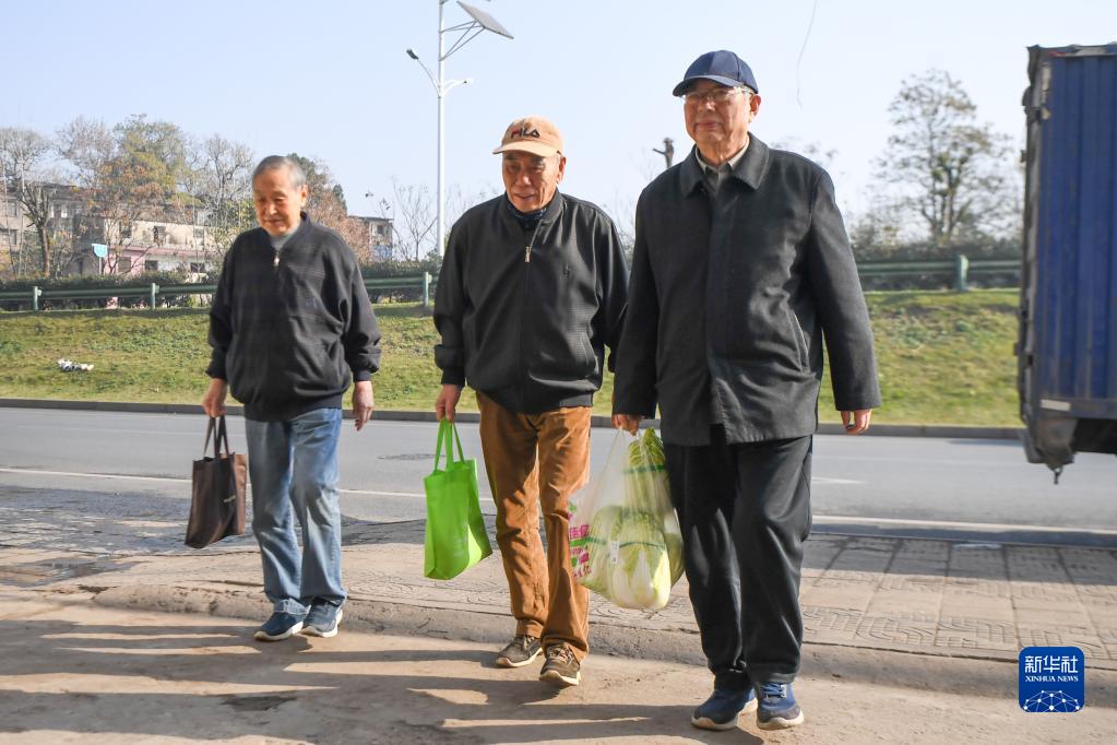 12月23日,魏鎮、馬利民、余國基(右起)提著備好的面、菜來到寶南飯店。新華社記者 薛宇舸 攝