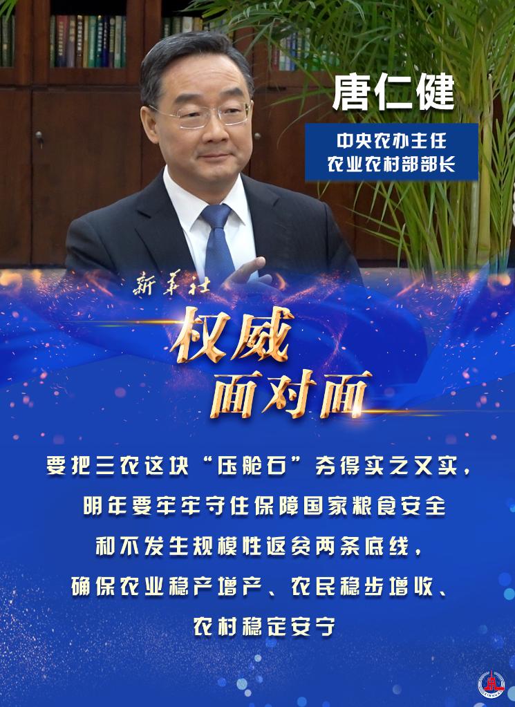 中央經濟工作會議定調明年經濟工作,部署保障糧食和重要農副產品供給安全、全面推進鄉村振興等任務。如何發揮好“三農”工作“壓艙石”作用?全面推進鄉村振興如何發力?日前,中央農辦主任、農業農村部部長唐仁健接受了新華社記者采訪。