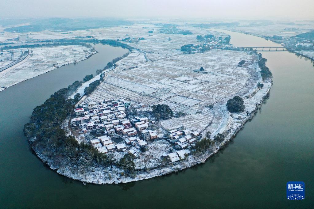 12月27日拍攝的江西省宜春市上高縣新界埠鎮的雪景(無人機照片)。