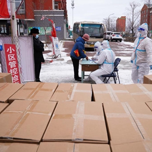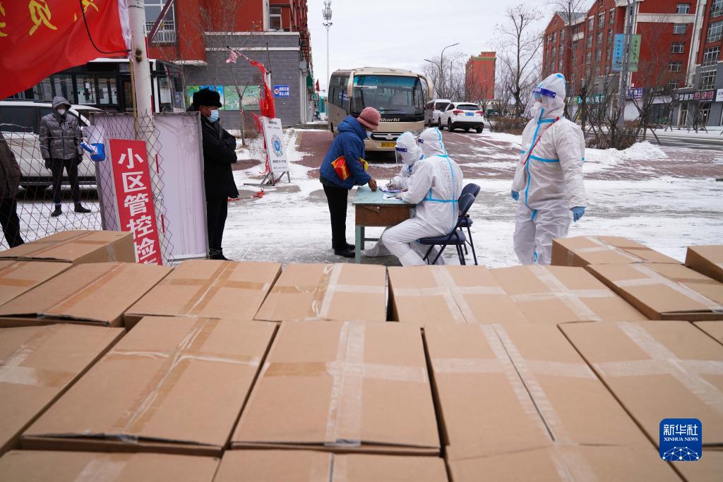 在黑龍江省黑河市愛輝區一小區,社區工作人員為居民發放免費生活物資(11月10日攝)。新華社記者 王松 攝