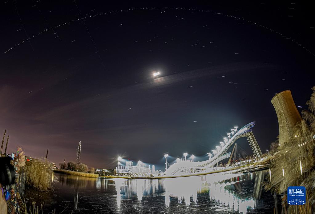 2021年12月11日,在北京首鋼滑雪大跳臺旁拍攝的中國空間站過境照片(軌跡為多張照片堆棧)。