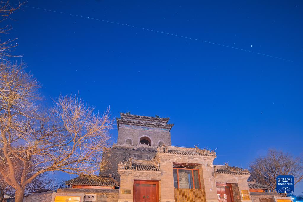 2021年12月14日,在北京市鐘鼓樓文化廣場拍攝的中國空間站過境照片(軌跡為多張照片堆棧)。