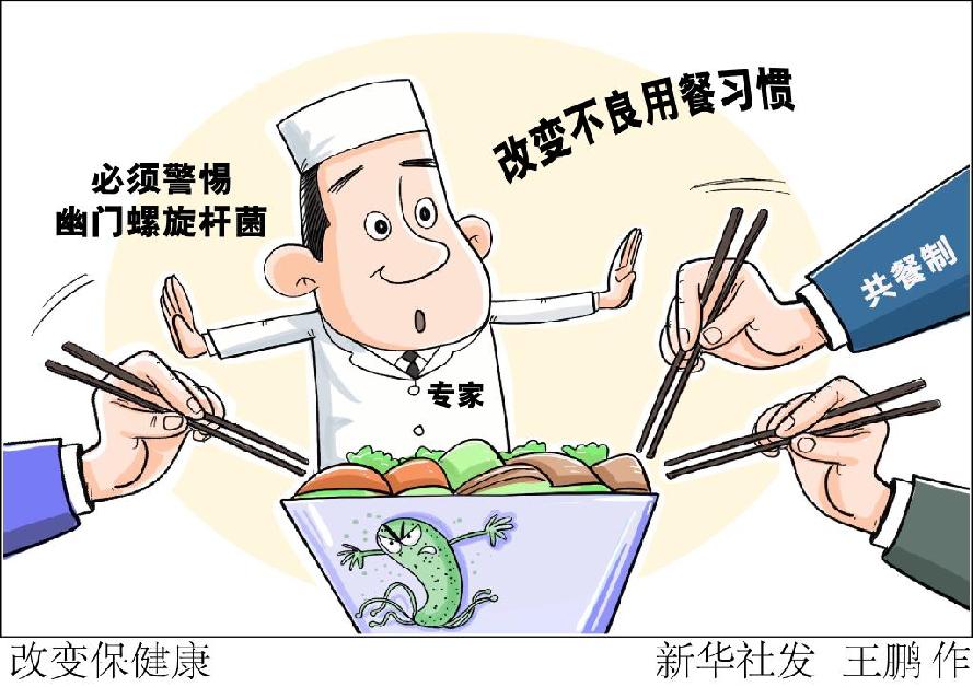 實行餐具的消毒,推行公筷制、分餐制是預防幽門螺旋桿菌感染的最有效手段。我國幽門螺旋桿菌感染“一人得病,全家傳染”的情況并不少見,主要是因為家庭內共餐制使得幽門螺旋桿菌通過唾液進行傳染,吃飯時互相用筷子夾菜,也會增加共餐者的感染風險,且幼兒與老人更易感染。