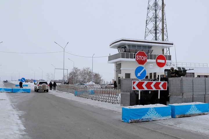 1月7日,哈薩克斯坦執法人員在努爾蘇丹的進出城檢查站加強巡查。新華社發(奧斯潘諾夫攝)
