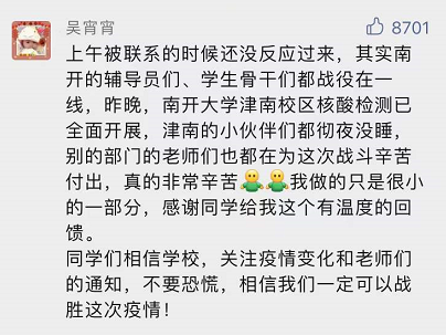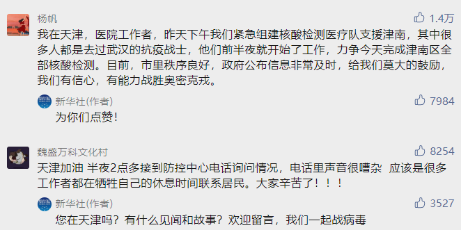 我在天津,醫院工作者,昨天下午我們緊急組建核酸檢測醫療隊支援津南,其中很多人都是去過武漢的抗疫戰士,他們前半夜就開始了工作,力爭今天完成津南區全部核酸檢測。目前,市里秩序良好,政府公布信息非常及時,給我們莫大的鼓勵,我們有信心,有能力戰勝奧密克戎。