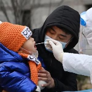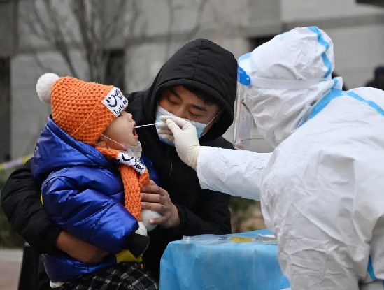 1月9日,在天津市西青區中北鎮錦曦花苑社區一處核酸檢測點,家長抱著孩子進行核酸檢測。新華社記者李然攝