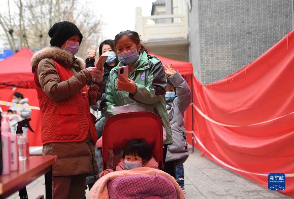 1月8日,在鄭州市金水區花園路街道一核酸檢測點,志愿者協助市民進行掃碼登記。