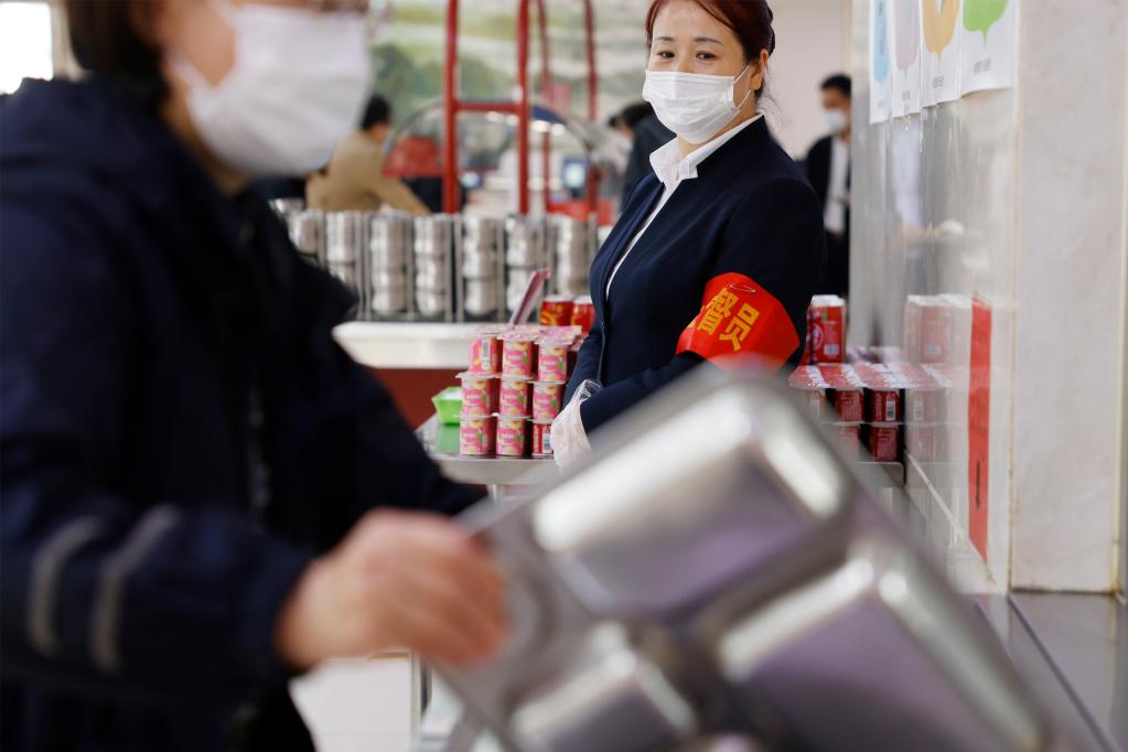 在某中央國家機關食堂,工作人員監督提示就餐員工踐行“光盤行動”。(新華社記者劉彬 攝)