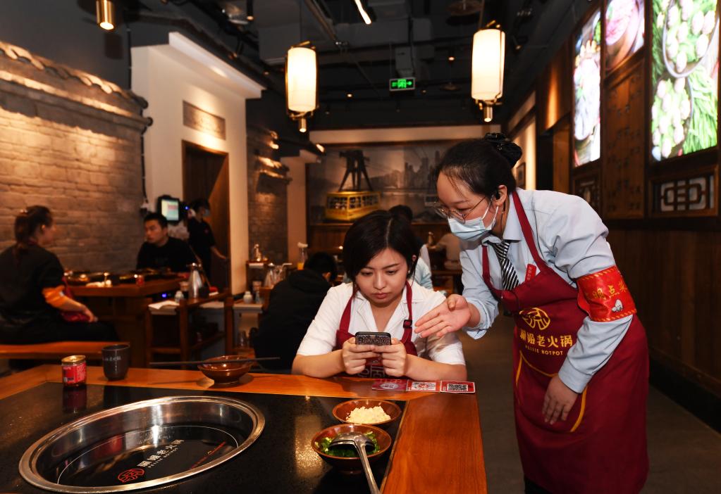 重慶來福士一家老火鍋餐廳的“文明點菜員”(右一)向消費者推薦“小份菜”。(新華社記者王全超 攝)