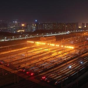 1月16日晚,動車組列車??吭谥袊F路蘭州局集團有限公司蘭州車輛段蘭州西動車運用所整備場上,為1月17日開始的2022年春運做好準備(無人機照片)。新華社記者 杜哲宇 攝