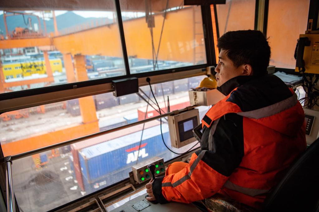 “我在正式操作龍門吊之前,在大連參加了為期6個月的培訓課程。這些年,隨著中歐班列集裝箱的增多,我的技術也在不斷進步?!编嵱觌p說,他剛開始做這份工作時,經常覺得坐在這個小房間里很無聊,因為當時沒有多少貨物可供裝卸。但是后來,他每天的工作量從60個集裝箱增加到250個,最多時一晚上裝卸了350個集裝箱。