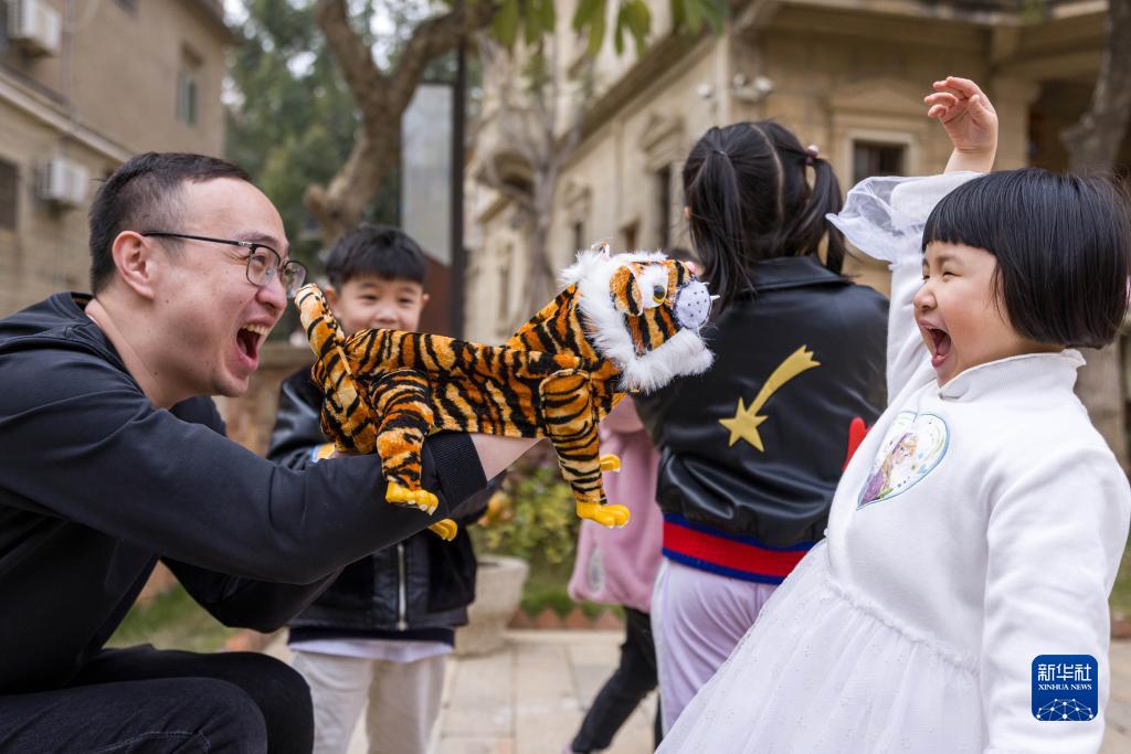 1月16日,在福建省泉州晉江市梧林傳統村落一場非遺藝術“沉浸式”公益演出上,晉江市掌中木偶藝術保護傳承中心為游客表演傳統劇目《虎趣》,演員李云峰(左一)與臺下小觀眾互動。