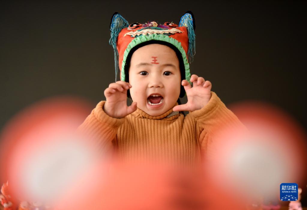 1月18日,在山東省淄博市沂源縣悅莊中心幼兒園,一名頭戴虎頭帽的小朋友在扮演小老虎。