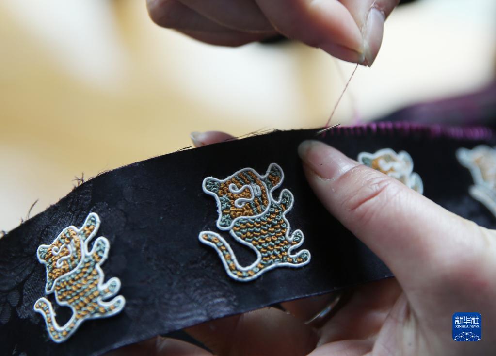1月12日,在貴州省黔東南苗族侗族自治州雷山縣丹江鎮貓貓河村,一名繡娘趕制“萌虎”元素文創產品。