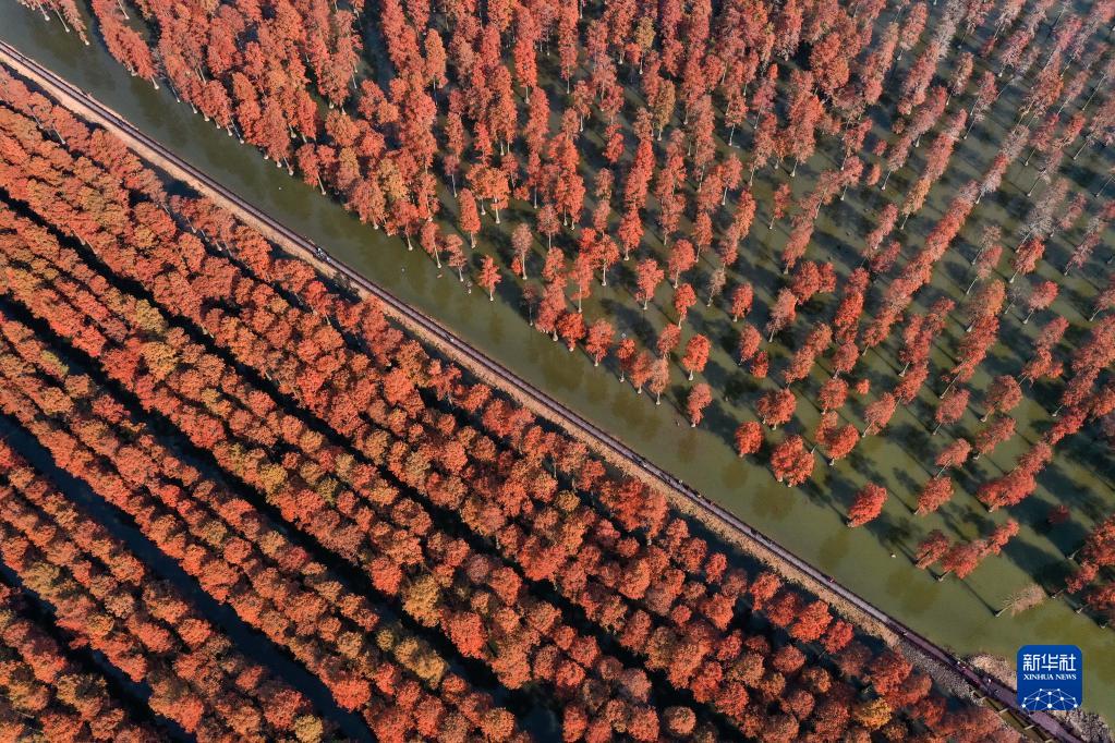 2021年12月3日拍攝的武漢漲渡湖濕地公園“水上森林”景色(無人機照片)。
