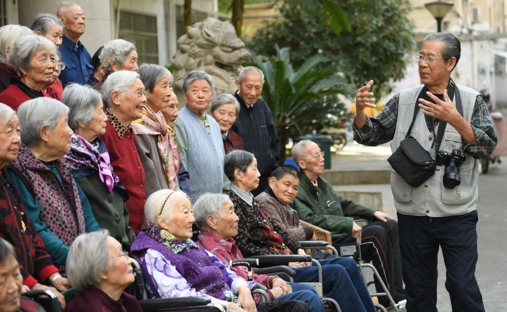 2020年10月14日,謝金聲(右)在浙江省湖州市吳興區愛山街道紅豐西塘社區老年服務中心拍合影前向老人們提示注意事項。80多歲的湖州老人謝金聲是一名攝影愛好者,從2000年開始,他每年為社區里老年公寓的老人拍一張合影。從黑白到彩色、從膠卷到數碼,他說:“希望能拍到拍不動為止?!毙氯A社記者翁忻旸攝