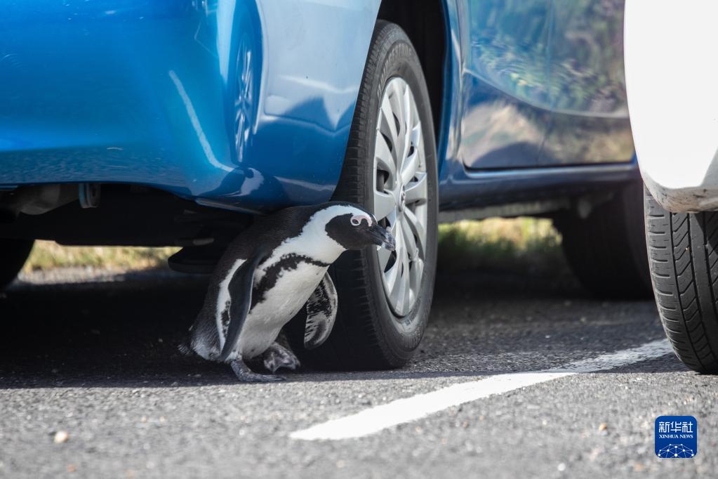 2月5日,在南非西蒙鎮的一個停車場,一只非洲企鵝從車底鉆出來。