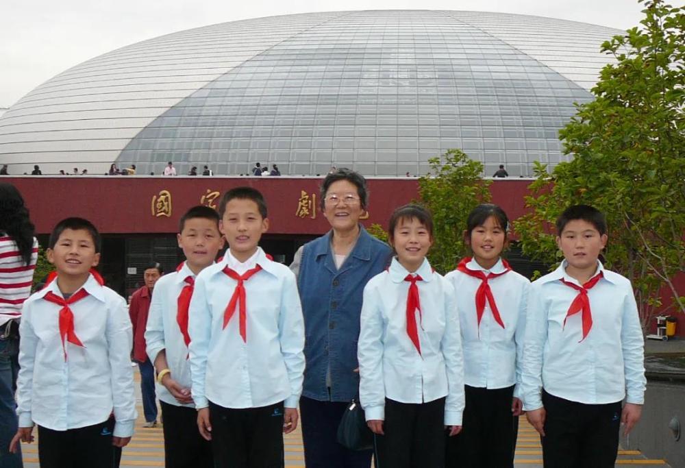 這是鄧小嵐和馬蘭小樂隊成員在國家大劇院前的合影(2008年10月4日攝)。新華社發