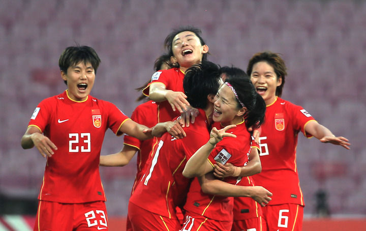 2月6日,中國隊球員在2022女足亞洲杯決賽后慶祝。新華社發(賈韋德·達爾攝)