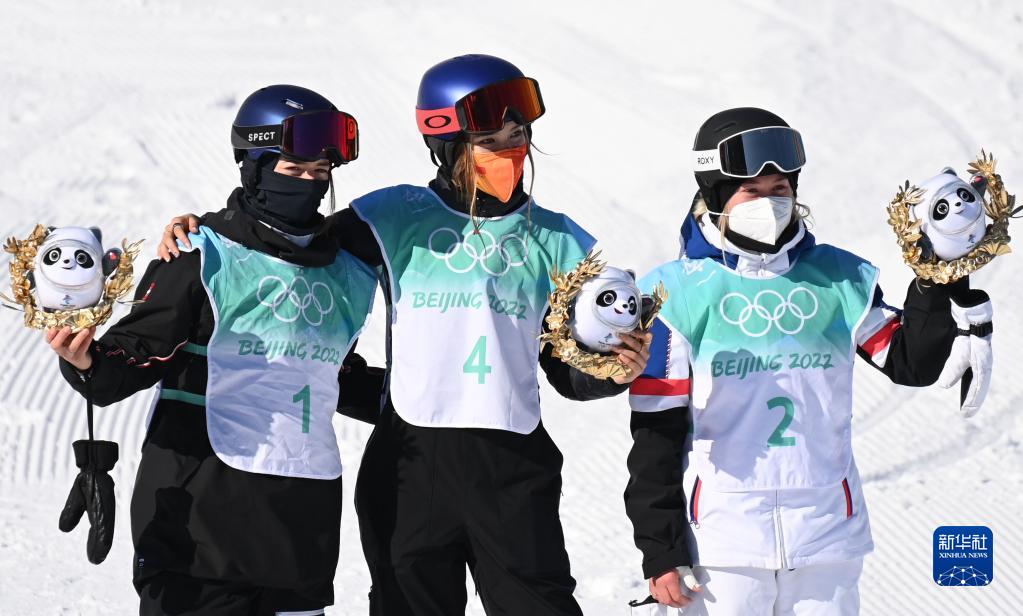 2月8日,奪得冠軍的中國選手谷愛凌(中)、獲得亞軍的法國選手苔絲、獲得季軍的瑞士選手瑪蒂爾德·格雷莫德在頒發紀念品儀式上。新華社記者熊琦攝